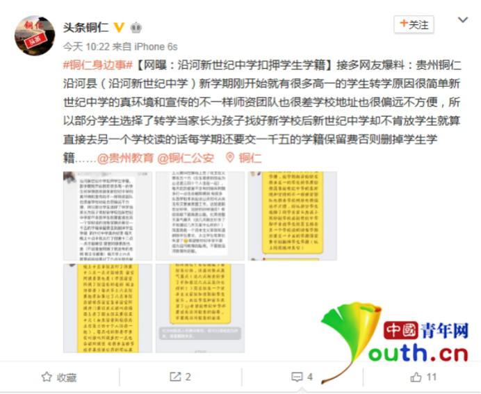 今天上午,記者聯(lián)系當(dāng)?shù)亟逃衷儐柺欠裾莆铡皩W(xué)籍保留費(fèi)”的相關(guān)情況,教育局辦公室工作人員表示,教育局昨天下午便收到消息,并于今天上午由正副局長帶隊(duì)前往新世紀(jì)中學(xué)調(diào)查情況,調(diào)查結(jié)果會交給沿河縣委宣傳部。今天下午,記者聯(lián)系宣傳部,工作人員表示,新世紀(jì)中學(xué)已將所收“學(xué)籍保留費(fèi)”退還給學(xué)生家長,常務(wù)校長羅元慶被教育局嚴(yán)肅批評,并被學(xué)校董事會解除職務(wù)。