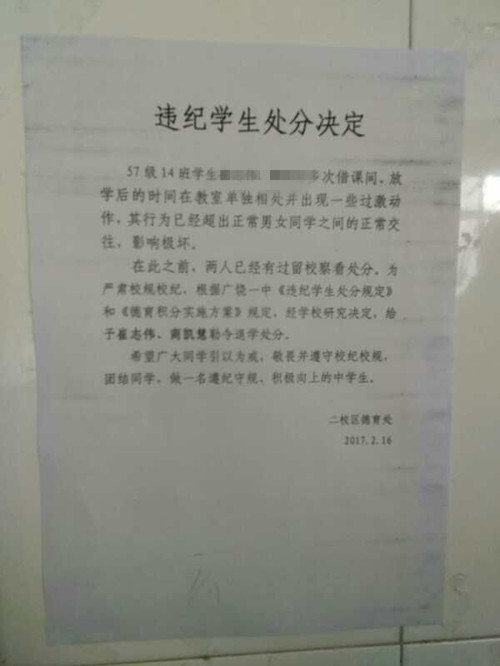 17日晚,商先生向大眾網(wǎng)記者提供了一份落款為二校區(qū)德育處的違紀學生處分決定,大體內(nèi)容為:57級14班學生阿強(化名)、小芳多次借課間、放學后的時間在教室單獨相處并出現(xiàn)一些過激動作,其行為已經(jīng)超出正常男女同學之間的正常交往,影響極壞。在此之前,兩人已經(jīng)有過留校察看處分。為嚴肅校規(guī)校紀,根據(jù)廣饒一中《違紀學生處分規(guī)定》和《德育積分實施方案》規(guī)定,經(jīng)學校研究決定,給予兩人勒令退學處分。