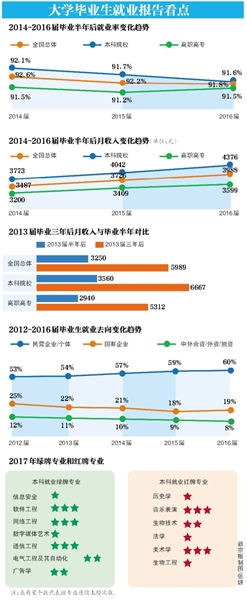 昨日下午,由麥可思研究院撰寫、社會(huì)科學(xué)文獻(xiàn)出版社出版的《2017年中國(guó)本科生就業(yè)報(bào)告》在北京發(fā)布。報(bào)告對(duì)14.7萬(wàn)2016屆大學(xué)本科畢業(yè)生和14.2萬(wàn)高職高專畢業(yè)生進(jìn)行跟蹤調(diào)查,并對(duì)11.4萬(wàn)2013屆大學(xué)本科畢業(yè)生三年后的就業(yè)和收入情況再次調(diào)查。 報(bào)告調(diào)查分析顯示,2016屆本科畢業(yè)生半年后月收入達(dá)到4367元,比2015屆增長(zhǎng)334元。從各專業(yè)就業(yè)率、收入和就業(yè)滿意度等方面數(shù)據(jù)分析,信息安全、軟件工程等專業(yè)因就業(yè)率高、薪資好被列為“綠牌專業(yè)”;歷史學(xué)、美術(shù)學(xué)等專業(yè)被列為“紅牌專業(yè)”。 【收入】 2013屆畢業(yè)三年后收入增長(zhǎng)84% 調(diào)查顯示,本科院校2016屆畢業(yè)生半年后月收入為4376元。2016屆本科畢業(yè)生有10.3%月收入在7000元以上,2012~2016屆本科畢業(yè)生平均月收入從3366元增長(zhǎng)到4376元,增幅為30%。 報(bào)告撰寫者郭嬌介紹,考慮到通貨膨脹,再根據(jù)CPI進(jìn)行調(diào)整后,2012~2016屆本科畢業(yè)生的平均月收入從3366元增長(zhǎng)到4043元,增幅為20%。 對(duì)于不同專業(yè)、不同職業(yè)和不同行業(yè)的本科畢業(yè)生收入水平,報(bào)告調(diào)查顯示,2016屆本科畢業(yè)半年后月收入最高的是工學(xué)(4676元),最低的是醫(yī)學(xué)(3766元);職業(yè)類月收入最高的是“互聯(lián)網(wǎng)開(kāi)發(fā)及應(yīng)用”(5679元);月收入最高的行業(yè)類為“媒體、信息及通信產(chǎn)業(yè)”(5174元)。 報(bào)告對(duì)11.4萬(wàn)2013屆大學(xué)本科畢業(yè)生三年后的就業(yè)和收入情況再次調(diào)查。報(bào)告認(rèn)為,大學(xué)生畢業(yè)3年后收入增長(zhǎng)迅速。2013屆畢業(yè)三年后(即2016年時(shí))平均月收入為5989元。與其畢業(yè)時(shí)相比,漲幅為84%。 本科畢業(yè)生三年后月收入為6667元,是2016年農(nóng)民工人均月收入(3275元)的兩倍多;2013屆高職高專畢業(yè)生三年后月收入為5312元,比2016年農(nóng)民工人均月收入高2037元。 分析 高等教育回報(bào)效果明顯 報(bào)告撰寫者郭嬌表示,高等教育的回報(bào)在三年內(nèi)效果明顯。本科和高職高專畢業(yè)生職業(yè)發(fā)展的后發(fā)力較強(qiáng)。 對(duì)于“上大學(xué)沒(méi)用”“大學(xué)生收入不如農(nóng)民工”這類說(shuō)法,人社部相關(guān)專家表示,如果盯著個(gè)案,農(nóng)民工中的確存在月薪近萬(wàn)乃至更高的人,但高校畢業(yè)生中更不乏用人單位搶著要、開(kāi)出幾十萬(wàn)年薪的事例?!耙詡€(gè)例比較得出這樣的結(jié)論不合適,從總體上看,高校畢業(yè)生頭5年的薪水增幅遠(yuǎn)高于社會(huì)平均工資增幅?!边@位專家說(shuō)。 【專業(yè)】 軟件工程連續(xù)三年被列“綠牌專業(yè)” 報(bào)告依據(jù)各專業(yè)的失業(yè)人數(shù)、就業(yè)率、月收入,以及學(xué)生對(duì)專業(yè)就業(yè)的滿意度評(píng)價(jià)等數(shù)據(jù),列舉了2017年的“綠牌專業(yè)”和“紅牌專業(yè)”。綠牌專業(yè)指失業(yè)量較小,就業(yè)率、薪資和就業(yè)滿意度綜合較高的專業(yè),為需求增長(zhǎng)型專業(yè)。 2017年本科就業(yè)“綠牌專業(yè)”包括:信息安全、軟件工程、網(wǎng)絡(luò)工程、數(shù)字媒體藝術(shù)、通信工程、電氣工程及其自動(dòng)化、廣告學(xué)。其中,軟件工程、網(wǎng)絡(luò)工程、通信工程連續(xù)三屆是綠牌專業(yè)。比如,2016年軟件工程專業(yè)就業(yè)率達(dá)到96.5%。 “紅牌專業(yè)”則指失業(yè)量較大,就業(yè)率、薪資和就業(yè)滿意度綜合較低的專業(yè),為需求飽和型專業(yè)。2017年本科就業(yè)“紅牌專業(yè)”包括:歷史學(xué)、音樂(lè)表演、生物技術(shù)、法學(xué)、美術(shù)學(xué)、生物工程。其中,音樂(lè)表演、美術(shù)學(xué)連續(xù)三屆上“紅牌”榜。 分析 畢業(yè)半年后就業(yè)率總體穩(wěn)定 大學(xué)生就業(yè)難、就業(yè)不穩(wěn)定等話題,近年屢被提及。但報(bào)告認(rèn)為近年來(lái)大學(xué)畢業(yè)生畢業(yè)半年后的就業(yè)率保持了總體穩(wěn)定。 對(duì)此,人社部國(guó)際勞動(dòng)保障研究所副所長(zhǎng)劉軍認(rèn)為,我國(guó)GDP增速雖然放緩,但是大學(xué)生就業(yè)率始終保持穩(wěn)定,這顯示了就業(yè)質(zhì)量與經(jīng)濟(jì)質(zhì)量之間的關(guān)聯(lián)性?!?014年國(guó)際勞工組織發(fā)布了報(bào)告,對(duì)145個(gè)國(guó)家和地區(qū)實(shí)證研究表明,經(jīng)濟(jì)增長(zhǎng)的數(shù)量和質(zhì)量對(duì)就業(yè)的影響中,GDP增速不是最重要的,最重要的是經(jīng)濟(jì)發(fā)展的質(zhì)量?!眲④娬J(rèn)為,在經(jīng)濟(jì)發(fā)展轉(zhuǎn)型升級(jí)的過(guò)程中,經(jīng)濟(jì)結(jié)構(gòu)不斷調(diào)整,最有活力、最能創(chuàng)造就業(yè)的部分發(fā)展起來(lái),對(duì)總體的就業(yè)穩(wěn)定具有重要作用。 【預(yù)期】 專業(yè)工作不對(duì)口 超三成因不符預(yù)期 報(bào)告還對(duì)工作與專業(yè)的相關(guān)度進(jìn)行了分析,2016屆大學(xué)畢業(yè)生工作與專業(yè)相關(guān)度為66%。本科院校中,“211”院校畢業(yè)生的工作與專業(yè)相關(guān)度為72%,