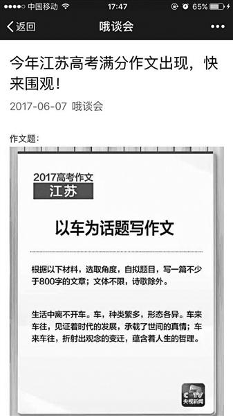 6月7日中午,全國高考語文考試科目結(jié)束,各地高考語文作文題目隨之在網(wǎng)絡上刷屏,據(jù)央視新聞微博消息,江蘇省的作文題目是“以車為話題寫作文”。