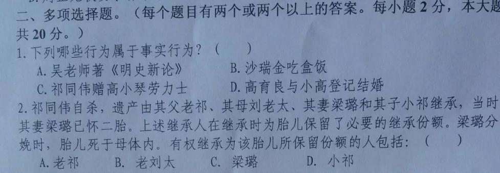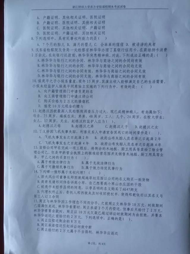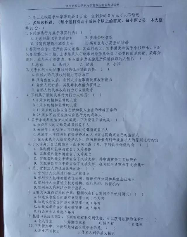 今年最火的電視劇,非《人民的名義》莫屬。 由于這部劇體現(xiàn)了“反腐”這一重大社會主題,有人專門將《人民的名義》設計成了一套高考模擬題,比如這道: 《人民的名義》一經(jīng)播出,便收獲觀眾熱情的點贊。它反映著當前中國反腐敗斗爭的實踐,回應著反腐敗的民心所愿。反對腐敗、建設廉潔政府,必須“把權(quán)力關(guān)進制度的籠子里”。下列做法中,直接體現(xiàn)這一要求的是( ) ①國務院取消下放618項行政審批事項 ②某省民政廳開展“廉政親情寄語”活動 ③某市發(fā)展與改革委員會推行“開放式?jīng)Q策” ④某全國人大代表提出“規(guī)范網(wǎng)絡反腐”議案 A.①③ B.①④ C.②③ D.②④ 追劇的童鞋們,是不是頓時感覺整部劇是滿滿的政治考點?雖然高考已經(jīng)過去,但是期末考還在路上,萬一考到了呢? 昨天,浙江財經(jīng)大學東方學院法學專業(yè)的學生就碰上了“萬一”——《民法總論》的期末考試試卷,竟通篇引用《人民的名義》?。?!