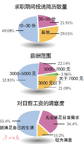 在應(yīng)屆生求職期間投遞簡歷的數(shù)量方面,49.08%的學(xué)生投遞簡歷數(shù)量在10~30份之間,21.91%的學(xué)生投遞了30~50份簡歷才找到工作。