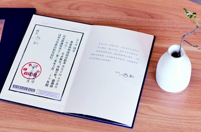 在溫州大學(xué)本科招生錄取現(xiàn)場,一本本藍(lán)色燙金的錄取通知書正整整齊齊地擺放在會議桌上,整裝待發(fā)。通知書整體采用中國傳統(tǒng)文書褶子樣式,封面是燙金的“錄取通知書”和學(xué)校?;?,封底是王蒙題詞的校訓(xùn)“求學(xué)問是,敢為人先”。展開五折折頁,正面分別是瑞安市東源村木活字傳承人親手印刷的錄取證書頁、校長寄語、校歌,背面則是以溫州地理標(biāo)志大羅山為底、溫大建筑為前景的山水畫卷。