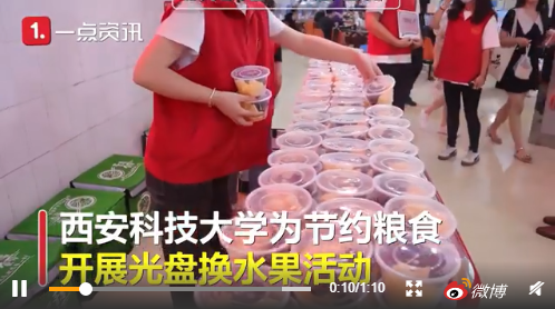 西安科技大學(xué)為節(jié)約糧食開展了光盤換水果的活動(dòng),學(xué)生們只要把飯菜吃完清盤,就可以換到一份飯后果盤和代金券。校方介紹,他們每餐準(zhǔn)備了500份水果,該活動(dòng)推出之后,收餐量減少了40%到50%。