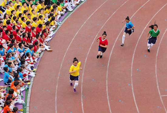2019年6月6日,河北秦皇島,海港區(qū)新一路小學(xué)學(xué)生在全國學(xué)校體育聯(lián)盟(教學(xué)改革)海港區(qū)實(shí)驗校階段性成果展示活動中表演趣味比賽項目。視覺中國供圖
