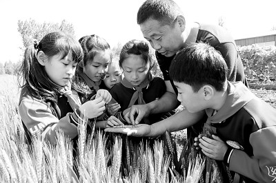 2021年5月21日,山東省高密市豪邁小學(xué)師生來到麥田“寫作業(yè)”,他們在農(nóng)民伯伯的指導(dǎo)下零距離觀察小麥,學(xué)習(xí)“小滿”節(jié)氣的農(nóng)耕常識(shí)。光明圖片