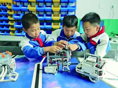 白水川小學(xué)機(jī)器人社團(tuán)的學(xué)生在調(diào)試機(jī)器人。