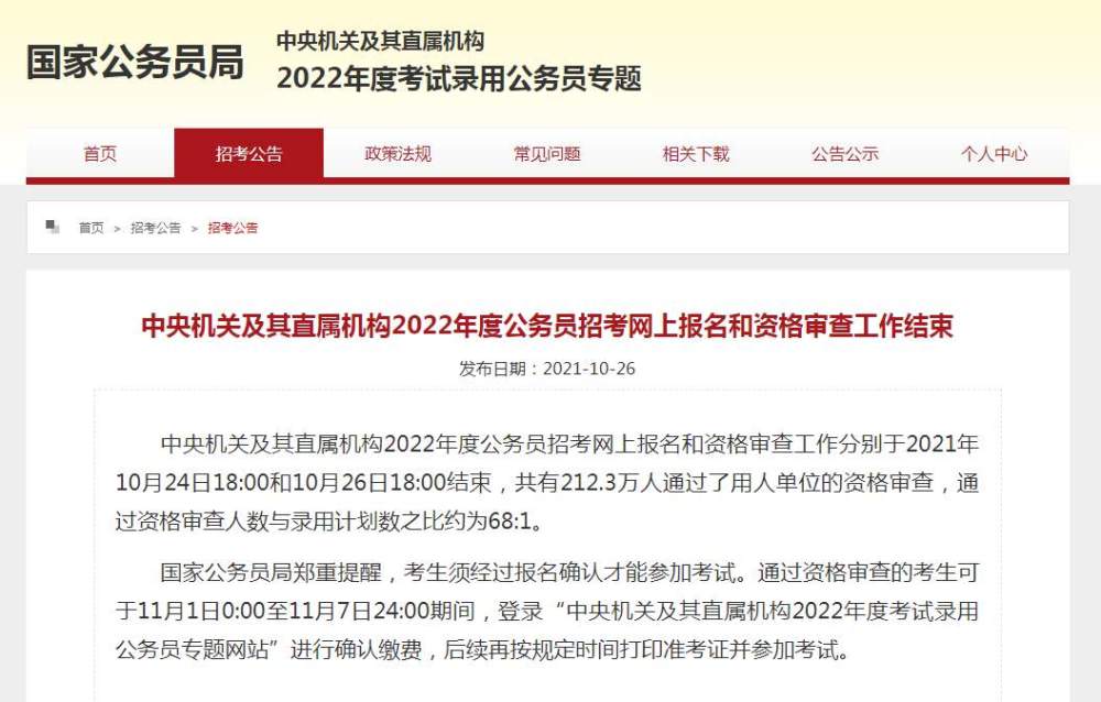 據(jù)國家公務(wù)員局網(wǎng)站消息,中央機關(guān)及其直屬機構(gòu)2022年度公務(wù)員招考網(wǎng)上報名和資格審查工作分別于2021年10月24日18:00和10月26日18:00結(jié)束,共有212.3萬人通過了用人單位的資格審查,通過資格審查人數(shù)與錄用計劃數(shù)之比約為68:1。 國家公務(wù)員局鄭重提醒,考生須經(jīng)過報名確認(rèn)才能參加考試。通過資格審查的考生可于11月1日0:00至11月7日24:00期間,登錄“中央機關(guān)及其直屬機構(gòu)2022年度考試錄用公務(wù)員專題網(wǎng)站”進行確認(rèn)繳費,后續(xù)再按規(guī)定時間打印準(zhǔn)考證并參加考試。