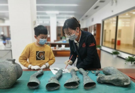 在三峽文物科技保護(hù)基地,小朋友在學(xué)習(xí)文物修復(fù)知識(shí)。(受訪者供圖)