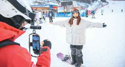 博主在河北崇禮云頂滑雪場錄制視頻。新華社記者 吳 壯攝