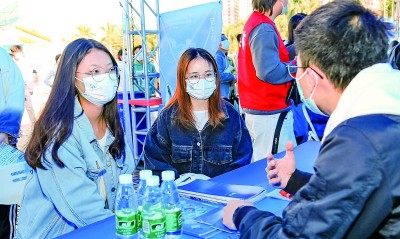 2021年珠海舉辦的“粵港澳大灣區(qū)大學(xué)生就業(yè)實(shí)習(xí)雙選會”上,學(xué)生與參會企業(yè)代表交流。新華社發(fā)