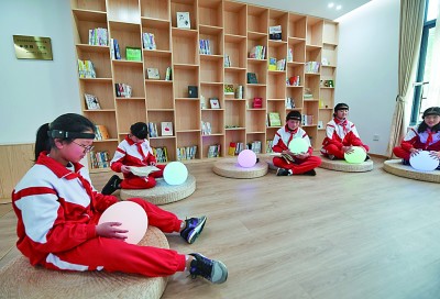 在浙江省嘉興市兒童青少年心理健康服務(wù)總站,學(xué)生們在體驗“腦波球”。新華社發(fā)