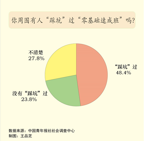 調(diào)查中,48.4%的受訪者表示周圍有人踩過“零基礎速成班”的坑,23.8%的受訪者表示沒有,27.8%的受訪者不清楚。