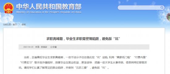 當(dāng)前,正值高校畢業(yè)生求職高峰期。教育部4月20日發(fā)布信息,提醒同學(xué)們認(rèn)真了解常見(jiàn)的就業(yè)陷阱,并做到“五防三要”,避免踩“坑”。