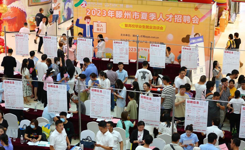 2023年7月15日,求職者在山東省滕州市舉行的夏季人才招聘會(huì)暨高校畢業(yè)生就業(yè)洽談會(huì)上了解崗位信息。新華社發(fā)(李志軍 攝)