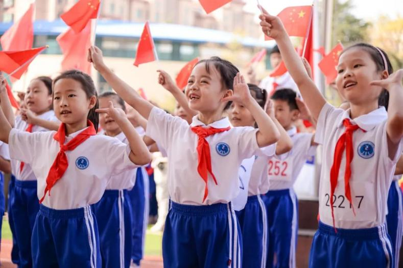 2023年10月12日,在山東省青島市城陽區(qū)第二實(shí)驗(yàn)小學(xué),學(xué)生們?cè)谇锛具\(yùn)動(dòng)會(huì)開幕式上進(jìn)行才藝展演。通訊員 張鷹 攝
