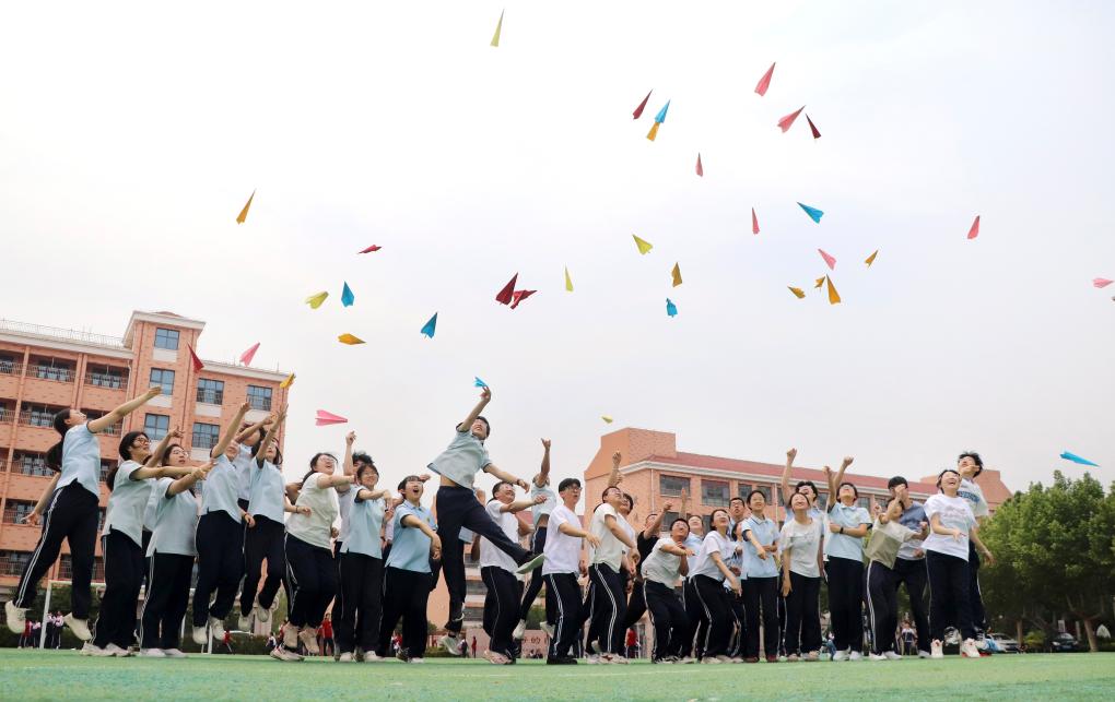 5月22日,在山東省高密市第五中學(xué),高三學(xué)生將寫有夢(mèng)想的紙飛機(jī)拋向空中。高考臨近,各地學(xué)校組織高三學(xué)生開展不同形式的減壓活動(dòng),幫助學(xué)生放松心情,迎接高考。新華社發(fā)(李海濤攝)
