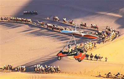 近年來(lái),在甘肅省敦煌市鳴沙山月牙泉景區(qū)運(yùn)營(yíng)的敦煌“飛天”通用航空項(xiàng)目,為游客提供低空飛行器旅游服務(wù),讓游客乘坐直升機(jī)、動(dòng)力滑翔機(jī),從空中欣賞大漠綠洲和月牙泉美景,沉浸式體驗(yàn)敦煌獨(dú)特魅力。圖為7月3日,游客乘坐滑翔機(jī)空中俯瞰敦煌大漠風(fēng)光。王斌銀攝(人民視覺)