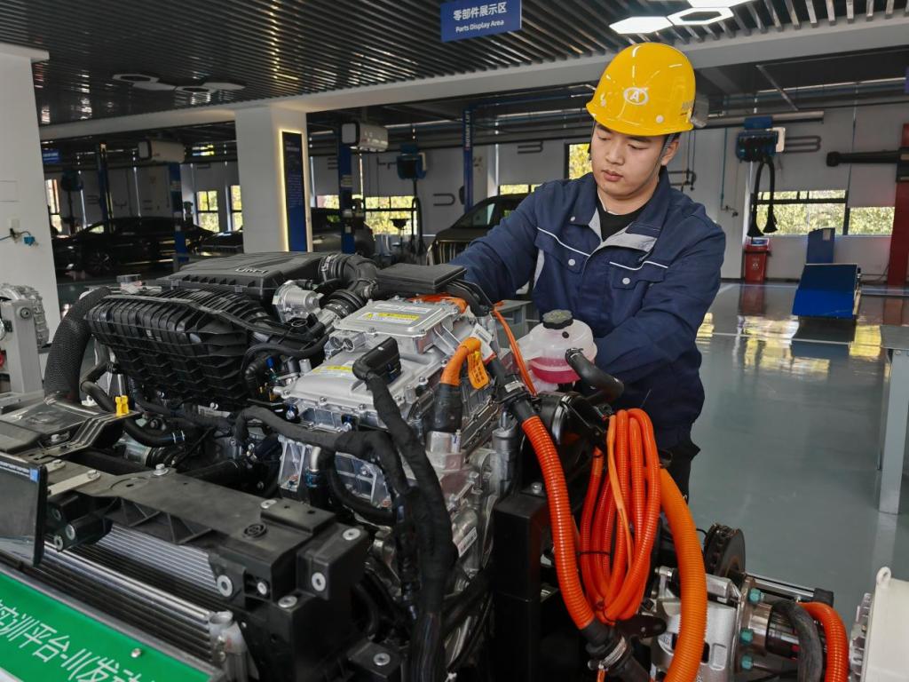 為支撐新能源汽車產(chǎn)業(yè)崛起,河南省全省高職院校開設(shè)相關(guān)專業(yè)點(diǎn)419個(gè),相關(guān)在校生22.14萬人。在河南機(jī)電職業(yè)學(xué)院與比亞迪共建的現(xiàn)場工程師學(xué)院,圍繞“現(xiàn)場工程師”培養(yǎng)開發(fā)了37門項(xiàng)目化課程。該校每年向鄭州航空港區(qū)比亞迪工廠輸送1000余名技能人才,不少學(xué)生迅速成長為產(chǎn)線骨干。“學(xué)校通過‘項(xiàng)目+人才’雙交付育人模式,極大地增強(qiáng)了人才培養(yǎng)與企業(yè)需求的匹配度?!北葋喌峡傃b車間主任如是說。