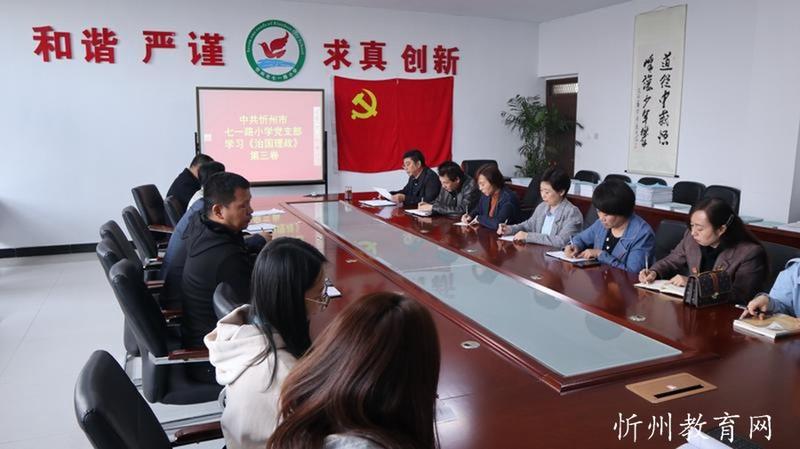 忻州市七一路小學(xué)網(wǎng)訊:10月19日,中共忻州市七一路小學(xué)黨支部專(zhuān)題學(xué)習(xí)《習(xí)近平談治國(guó)理政》第三卷。黨支部書(shū)記靳茂文作專(zhuān)題報(bào)告,全體黨員參加了會(huì)議,會(huì)議由黨辦主任史小榮主持。