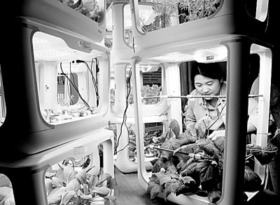 2023年5月13日,上海職業(yè)教育活動周,上海農林職業(yè)技術學院的教師展示智能種植箱里的綠植。 新華社發(fā)