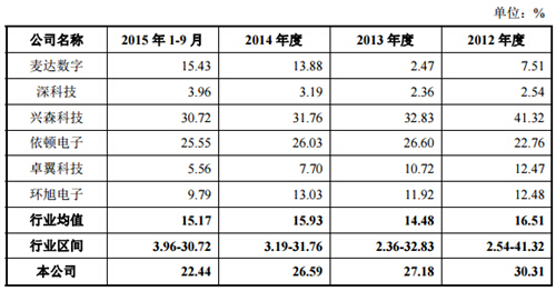但易德龍的盈利能力卻逐年下滑,招股書顯示,公司主營(yíng)業(yè)務(wù)毛利率在報(bào)告期內(nèi)持續(xù)下降,2012年為30.31%,到2015年9月末已降至22.44%。