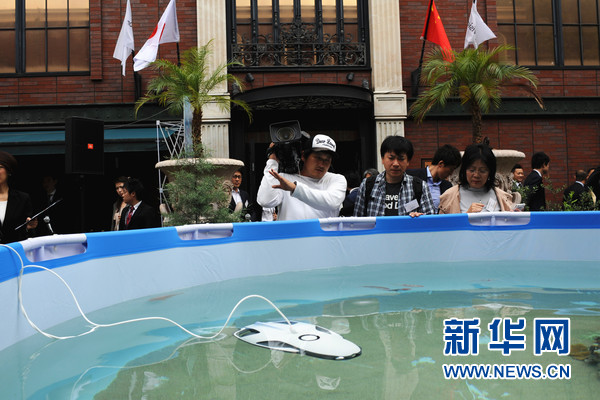 發(fā)布會(huì)場(chǎng)外舉行了PowerRay的水中操作演示。新華網(wǎng)記者 華義 攝
