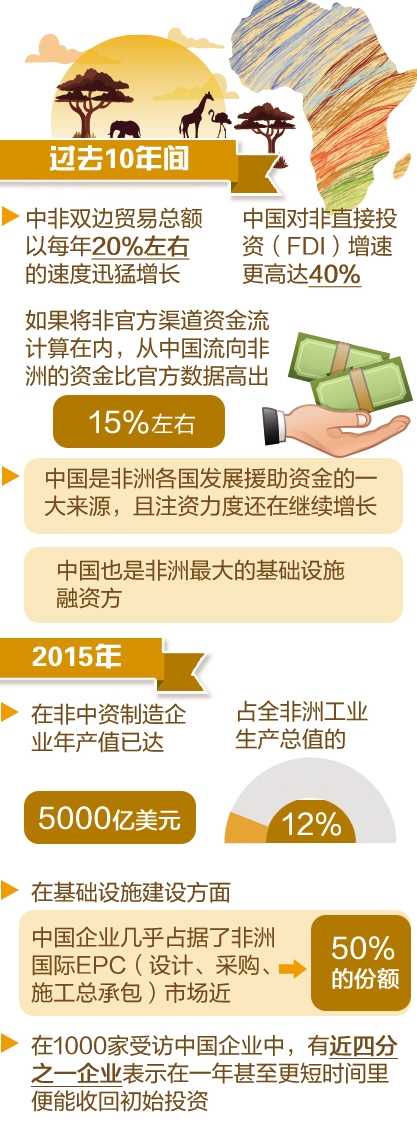 從經(jīng)營領(lǐng)域上看,調(diào)查顯示,中國企業(yè)在非洲的經(jīng)營領(lǐng)域十分廣泛,除制造業(yè)外,服務(wù)業(yè)企業(yè)占比達四分之一,貿(mào)易企業(yè)與建筑及房地產(chǎn)企業(yè)占比各為五分之一。2015年,在非中資制造企業(yè)年產(chǎn)值已達5000億美元,占全非洲工業(yè)生產(chǎn)總值的12%。在基礎(chǔ)設(shè)施建設(shè)方面,中國企業(yè)的主導(dǎo)地位更為明顯——幾乎占據(jù)了非洲國際EPC(設(shè)計、采購、施工總承包)市場近50%的份額。中國企業(yè)的盈利也相當(dāng)可觀,在1000家受訪企業(yè)中,有近四分之一企業(yè)表示在一年甚至更短時間里便能收回初始投資,三分之一的企業(yè)利潤率超過20%。而且,這些企業(yè)的市場觸覺極其敏銳,能夠迅速適應(yīng)新環(huán)境、響應(yīng)新機遇。這些企業(yè)主要側(cè)重滿足非洲日益增長的市場需求,而非出口業(yè)務(wù)。許多中國企業(yè)已在非洲開展了長期投資,有74%的受訪中資企業(yè)對未來發(fā)展前景抱有樂觀態(tài)度。