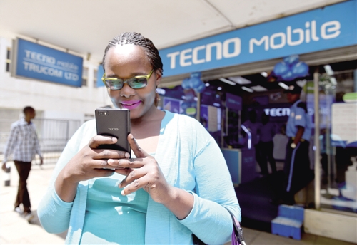 在肯尼亞首都內羅畢市中心,一名女子在一家傳音手機專賣店前使用自己的傳音手機。10年間,來自中國深圳的傳音手機在非洲年銷售量從不到100萬臺增至近8000萬臺,榮登國產(chǎn)手機海外銷量榜首,旗下社交聊天軟件注冊用戶過億。 (新華社發(fā))