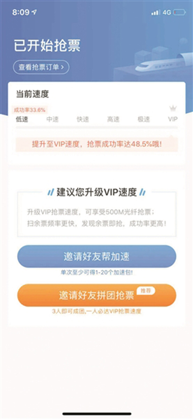 隨后,北青報(bào)記者打開某搶票軟件,按照與之前一樣的車次信息,其出現(xiàn)了多個(gè)選項(xiàng),其中,快速搶票選項(xiàng)顯示搶票成功率為81.0%,此項(xiàng)加速包價(jià)格20元;高速搶票選項(xiàng),搶票成功率為83.5%,加速包價(jià)格30元;急速搶票選項(xiàng)顯示成功率為85.3%,加速包為40元。而在VIP選項(xiàng)中,搶票成功率為86.8%,此項(xiàng)加速包為50元。