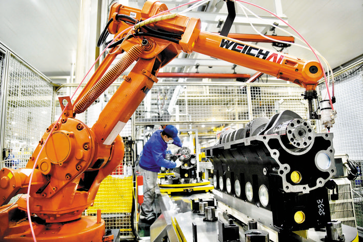 在位于山東濰坊的濰柴集團(tuán)一號(hào)工廠總裝車間,工人們?cè)诹魉€上裝配發(fā)動(dòng)機(jī)(3月19日攝)。 3月31日,國(guó)家統(tǒng)計(jì)局服務(wù)業(yè)調(diào)查中心、中國(guó)物流與采購(gòu)聯(lián)合會(huì)發(fā)布數(shù)據(jù),3月份,中國(guó)制造業(yè)采購(gòu)經(jīng)理指數(shù)(PMI)為52%,比上月回升16.3個(gè)百分點(diǎn)。