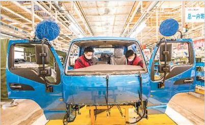 2月11日,在山東省青州市一家汽車制造企業(yè)生產(chǎn)車間內(nèi),工人正在組裝生產(chǎn)輕型卡車。 王繼林攝(人民視覺)