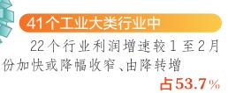 統(tǒng)計數(shù)據(jù)顯示,在41個工業(yè)大類行業(yè)中,有22個行業(yè)利潤增速較1至2月份加快或降幅收窄、由降轉增,占53.7%。