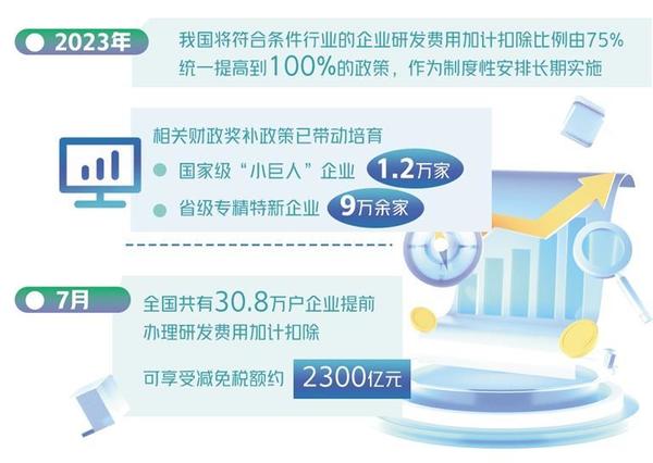 今年3月,國家將符合條件行業(yè)的企業(yè)研發(fā)費(fèi)用加計(jì)扣除比例由75%統(tǒng)一提高到100%的政策,作為制度性安排長期實(shí)施。在此基礎(chǔ)上,國家稅務(wù)總局會同財(cái)政部按照國務(wù)院決策部署,在原有10月份企業(yè)所得稅預(yù)繳申報(bào)和年度匯算清繳兩個(gè)時(shí)段享受研發(fā)費(fèi)用加計(jì)扣除政策的基礎(chǔ)上,再新增7月預(yù)繳申報(bào)期作為政策享受時(shí)點(diǎn),幫助企業(yè)提前享惠。