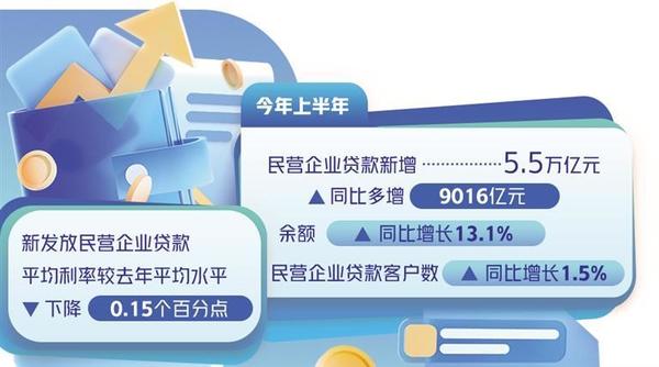 近年來(lái),信貸支持民營(yíng)企業(yè)的力度不斷加大,融資成本穩(wěn)中有降。數(shù)據(jù)顯示,今年上半年,民營(yíng)企業(yè)貸款新增5.5萬(wàn)億元,同比多增9016億元,余額同比增長(zhǎng)13.1%;民營(yíng)企業(yè)貸款客戶數(shù)同比增長(zhǎng)1.5%;新發(fā)放民營(yíng)企業(yè)貸款平均利率較去年平均水平下降0.15個(gè)百分點(diǎn)。