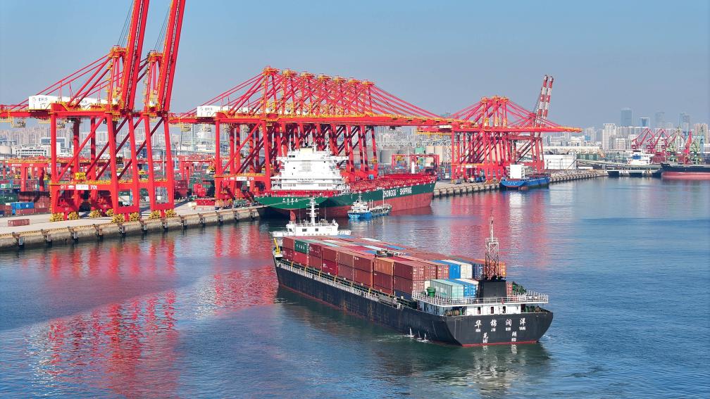 在山東港口日照港,貨輪停泊集裝箱碼頭裝卸作業(yè)(1月10日攝,無(wú)人機(jī)照片)。新華社記者 郭緒雷 攝