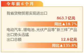 本報訊(記者孟婷)7月31日,記者從太原海關獲悉,據統(tǒng)計,今年前6個月,我省貨物貿易實現進出口863.7億元,同比增長18.7%,與此同時,電動汽車、鋰電池、光伏產品等“新三樣”產品出口勢頭迅猛,出口總額12.8億元,同比增長135.8%,遠超傳統(tǒng)出口商品。這些高科技產品不僅代表山西制造業(yè)轉型升級的最新成果,也為山西在國際市場競爭中贏得了新優(yōu)勢。