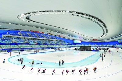 在北京國家速滑館,參加速度滑冰的小選手們?cè)谫惽盁嵘怼P氯A社發(fā)