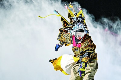 身穿京劇服飾的滑雪愛好者在吉林松花湖滑雪場(chǎng)滑雪。新華社發(fā)