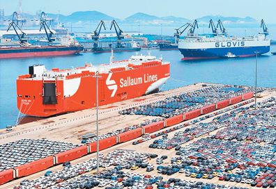 8月6日,在山東港口煙臺港,滾裝船在裝運(yùn)外貿(mào)車輛(無人機(jī)照片)。唐 克攝(新華社發(fā))