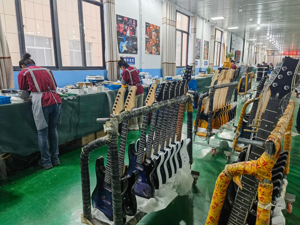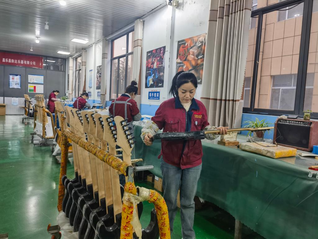 今天的鄌郚鎮(zhèn),總?cè)丝诓贿^8萬,卻有5000多人從事樂器產(chǎn)業(yè),年人均工資收入8萬元左右。電吉他等樂器生產(chǎn)成為當(dāng)?shù)鼐用褡钪匾氖杖雭碓础?/p>