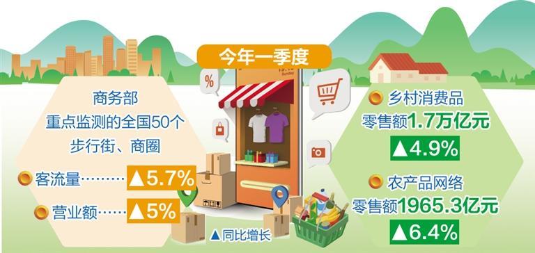 城市商業(yè)增速穩(wěn)定,一季度商務部重點監(jiān)測的全國50個步行街、商圈客流量、營業(yè)額同比分別增長5.7%、5%。縣域消費市場持續(xù)升溫,鄉(xiāng)村消費品零售額1.7萬億元,同比增長4.9%,增速高于城鎮(zhèn)0.4個百分點。農村電商蓬勃發(fā)展,全國農村網(wǎng)絡零售額6697.5億元,同比增長5.1%;農產品網(wǎng)絡零售額1965.3億元,同比增長6.4%。