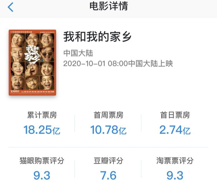 值得注意的是,國慶檔期間,《我和我的家鄉(xiāng)》連續(xù)8日實(shí)現(xiàn)單日票房過億。此外,該片在貓眼和淘票票評(píng)分均為9.3,實(shí)現(xiàn)了票房口碑雙豐收。