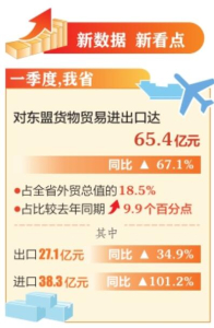 我省對(duì)東盟進(jìn)出口主要呈現(xiàn)以下特點(diǎn):從國(guó)別看,一季度我省對(duì)東盟10國(guó)進(jìn)出口值中,印度尼西亞居首位,進(jìn)出口32.9億元,占全省對(duì)東盟進(jìn)出口值的50.3%;其次為新加坡,進(jìn)出口13.5億元,占全省對(duì)東盟進(jìn)出口值的20.7%;對(duì)東盟10國(guó)的進(jìn)出口中有7國(guó)實(shí)現(xiàn)增長(zhǎng),其中對(duì)印度尼西亞和緬甸實(shí)現(xiàn)成倍增長(zhǎng)。我省對(duì)東盟出口機(jī)電產(chǎn)品19億元,同比增長(zhǎng)50.2%,占全省對(duì)東盟出口值的69.8%。主要進(jìn)口商品中,鐵合金出現(xiàn)大幅增長(zhǎng),各類金屬礦及礦砂量減值增,我省自東盟進(jìn)口鐵合金11.5萬(wàn)噸、貨值18.9億元,分別增加14.4倍和增長(zhǎng)10.2倍,占全省自東盟進(jìn)口值的49.3%,全部來(lái)自印度尼西亞;進(jìn)口各類金屬礦及礦砂29.6萬(wàn)噸,貨值5.8億元。