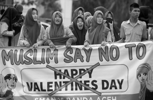 然而,在世界上一些觀念相對保守的國家或地區(qū),情人節(jié)仍然受到不同程度的抵制。據(jù)英國《每日郵報》13日報道,在印尼亞齊省一些地區(qū),慶祝情人節(jié)仍被視為“不法行為”,并被政府當局嚴令禁止。該省首府城市班達亞齊禁止市民互相贈送賀卡或巧克力。該市市長伊里查說:“我們的社區(qū)和穆斯林年輕人不應慶祝非伊斯蘭教的節(jié)日……政府當局有義務預防公眾和年輕一代人從事不法行為?!睋?jù)稱,當?shù)貓?zhí)法人員將在情人節(jié)前后加緊巡邏,嚴查送花或贈送禮物等行為。
