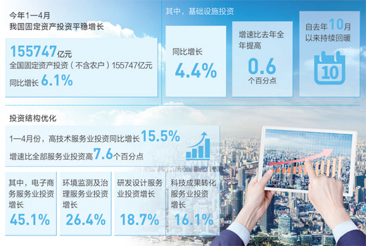 打開今年頭4個(gè)月的投資“成績(jī)單”,延續(xù)了增長(zhǎng)平穩(wěn)的態(tài)勢(shì)。今年前4月,全國(guó)固定資產(chǎn)投資同比增長(zhǎng)6.1%,增速比去年全年加快0.2個(gè)百分點(diǎn)。