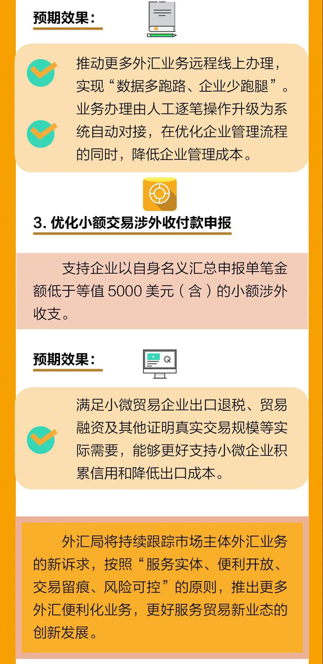 記者梳理發(fā)現(xiàn),《通知》包括9方面內(nèi)容,聚焦解決貿(mào)易新業(yè)態(tài)“小額、高頻、電子化”交易中結(jié)算不便捷問題。政策設(shè)計(jì)上,遵循“鼓勵(lì)創(chuàng)新、包容審慎”原則,積極適應(yīng)貿(mào)易新業(yè)態(tài)發(fā)展的實(shí)際需要。按照“服務(wù)實(shí)體、便利開放、交易留痕、風(fēng)險(xiǎn)可控”要求,放寬貿(mào)易新業(yè)態(tài)外匯政策,優(yōu)化外匯服務(wù),便利相關(guān)外匯業(yè)務(wù)辦理,實(shí)施“交易越合規(guī)、匯兌越便利”的信用約束和分類管理。