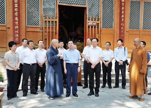 中央統(tǒng)一戰(zhàn)線工作領(lǐng)導(dǎo)小組一行在五臺山顯通寺調(diào)研檢查宗教工作。劉紀(jì)森 攝