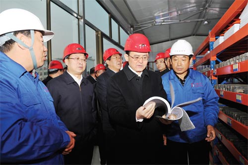 圖為市委書記李俊明在山西天寶集團有限公司調(diào)研質(zhì)量可追溯系統(tǒng)建設(shè)情況。(本報記者 劉紀(jì)森 攝)