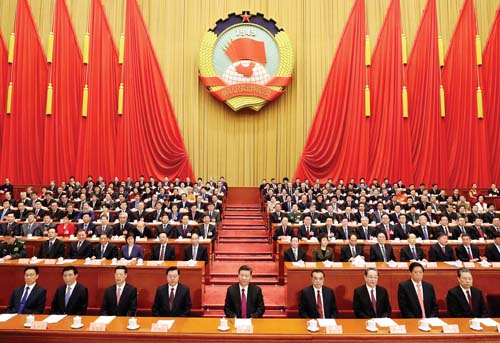 3 月15 日,中國(guó)人民政治協(xié)商會(huì)議第十三屆全國(guó)委員會(huì)第一次會(huì)議在北京閉幕。這是習(xí)近平、李克強(qiáng)、張德江、俞正聲、張高麗、栗戰(zhàn)書、王滬寧、趙樂(lè)際、韓正等在主席臺(tái)就座。新華社記者 丁 林 攝
